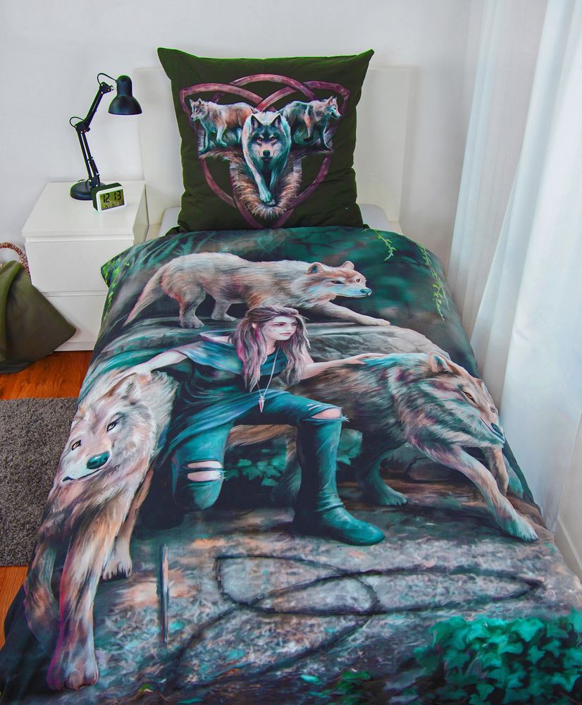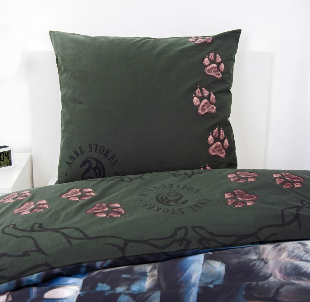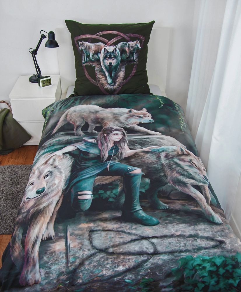 2 -teilige Renforcé - Bettwäschegarnitur "Anne Stokes Wolfswächterin" in 135x200cm in Grün/ Grau