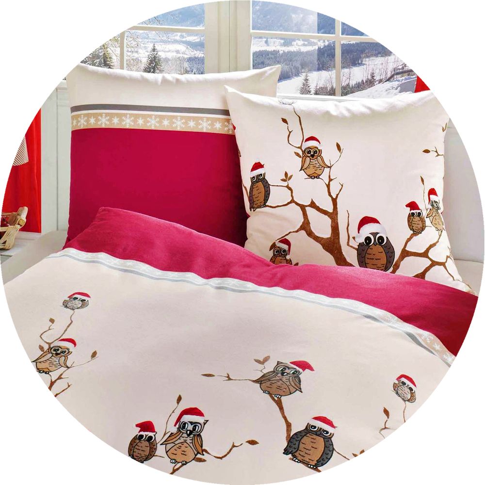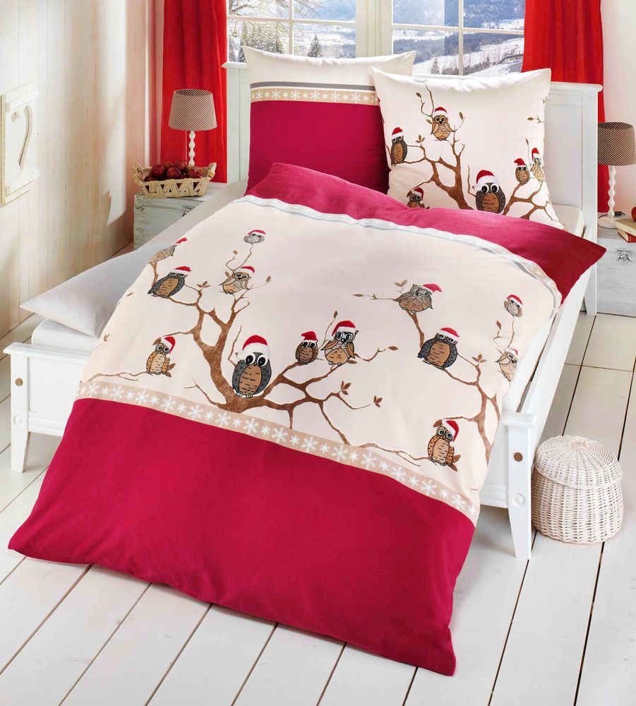 Kaeppel Fein Biber Bettwäsche 2 tlg. 135x200cm Wintereule Weihnachten Rot Beige