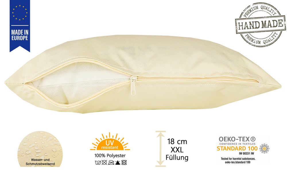 Mit diesen dekorativen XXL gefüllten Kopfkissen Serie der Marke "JACK" für den Innen- und Außenbereich, gelingt Ihnen das im Handumdrehen. Die Kissen sind äußerst pflegeleicht und sehen - da man sie seltener waschen muss - viel länger "wie neu" aus. Zusätzlich sind diese Kissenbezüge UV - Resistent und daher besonders lichtecht.
