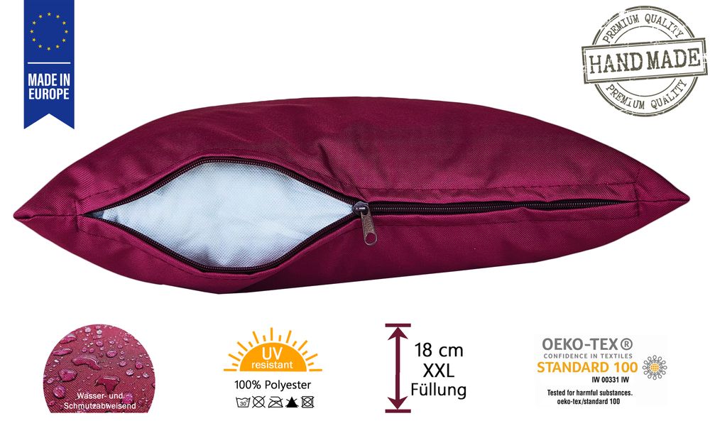 Mit diesen dekorativen XXL gefüllten Kopfkissen Serie der Marke "JACK" für den Innen- und Außenbereich, gelingt Ihnen das im Handumdrehen. Die Kissen sind äußerst pflegeleicht und sehen - da man sie seltener waschen muss - viel länger "wie neu" aus. Zusätzlich sind diese Kissenbezüge UV - Resistent und daher besonders lichtecht.