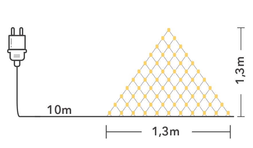 Dieses Lichternetz mit warmweißen LEDs hat eine Zuleitung von 10m. Es handelt sich um ein Netz in Kegel/Trapezform, welches ideal für Weihnachtsbäume ist. Einfach von der Spitze des Baumes nach unten überstülpen und die Weihnachtsbaumbeleuchtung ist fertig.